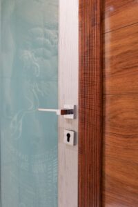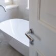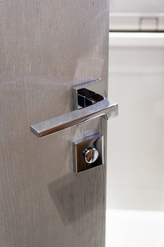 Na slici je prikazana kvaka Zelda sa pripadajućim leptirićem za kupatilska vrata, koji upotpunjuje estetsku celinu i čini ovaj model savršenim izborom za moderne prostore.